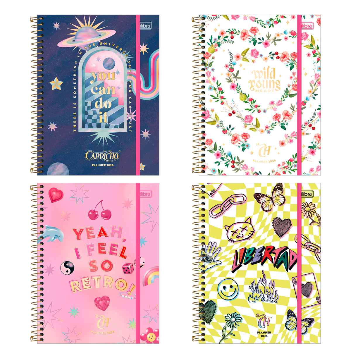 O Planner Espiral 17,7 x 24 cm Capricho 2024 pode ser usado para organizar os compromissos do dia a dia, em casa, no trabalho e na escola. Este produto, com visões mensal e semanal, além de algumas folhas para anotações, possui formato 17,7 x 24 cm, capa dura com detalhe metalizado e fechamento em elástico, espiral colorido, 80 folhas decoradas, adesivos e bolsa decorada em papel para guardar documentos.