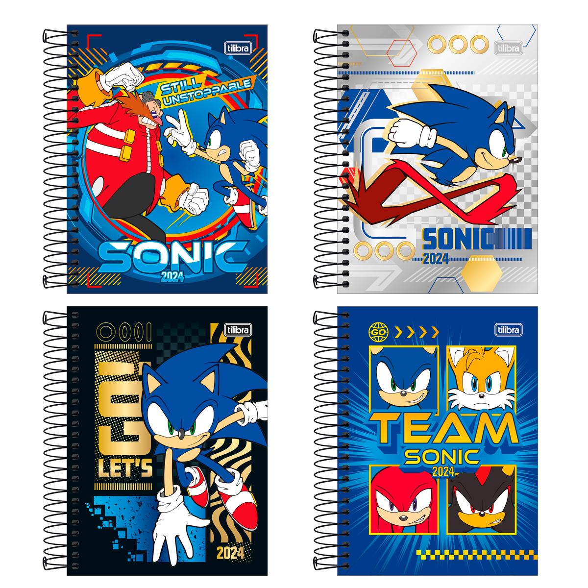 Agenda Espiral Diária 11,7 x 16,4 cm Sonic 2024 com visão de 1 dia por página, exceto sábado e domingo. Possui capa dura e bolsa plástica para guardar trabalhos e anotações, cartela adesiva e miolo decorado com personagens clássicos da série de jogos mais popular do mundo. Ideal para a organização do dia a dia.