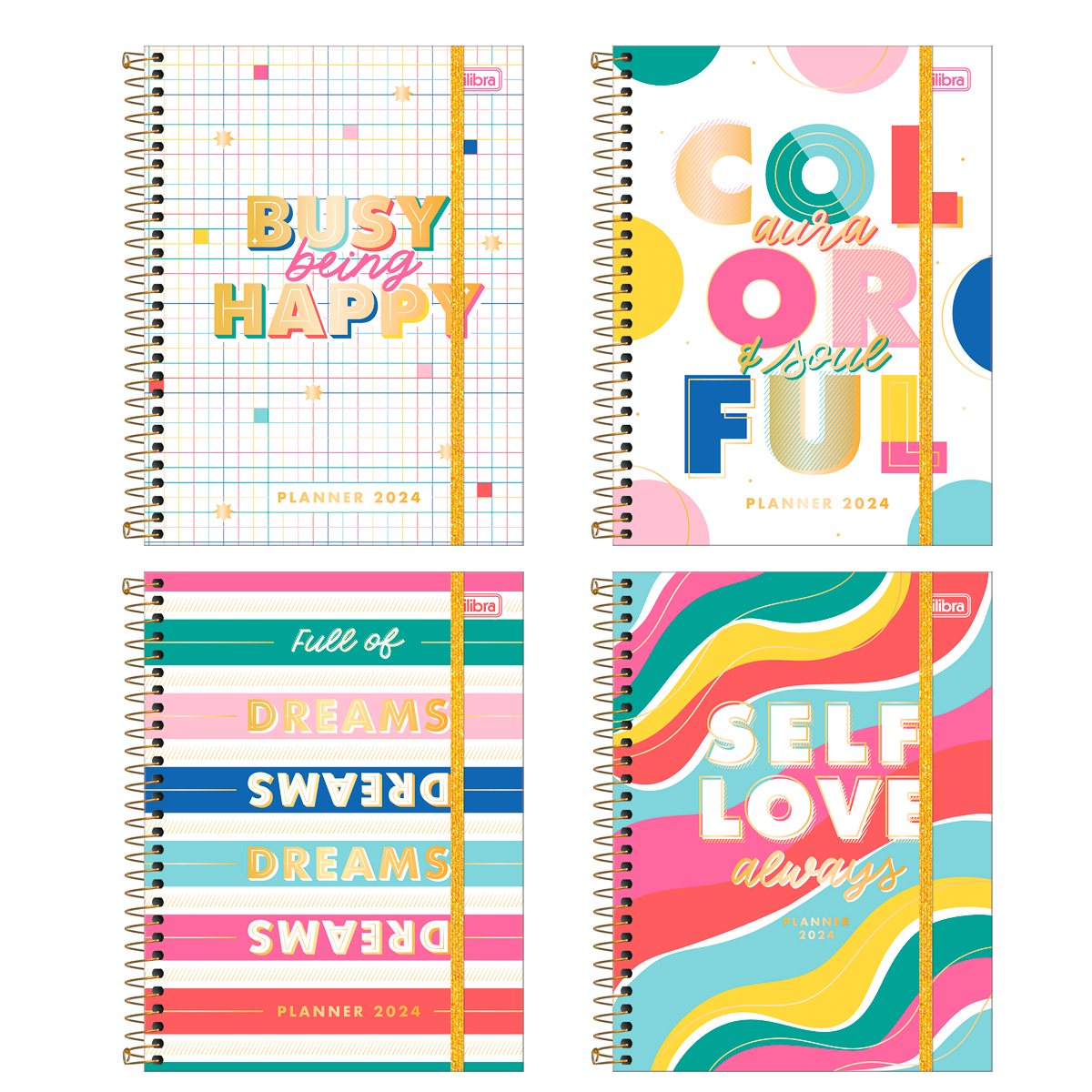 O produto, com visões anual, mensal e semanal, possui capa dura com fechamento em elástico, espiral dourado, adesivos, bolsa em papel para guardar documentos e miolo com 80 folhas em gramatura 90 g/m².