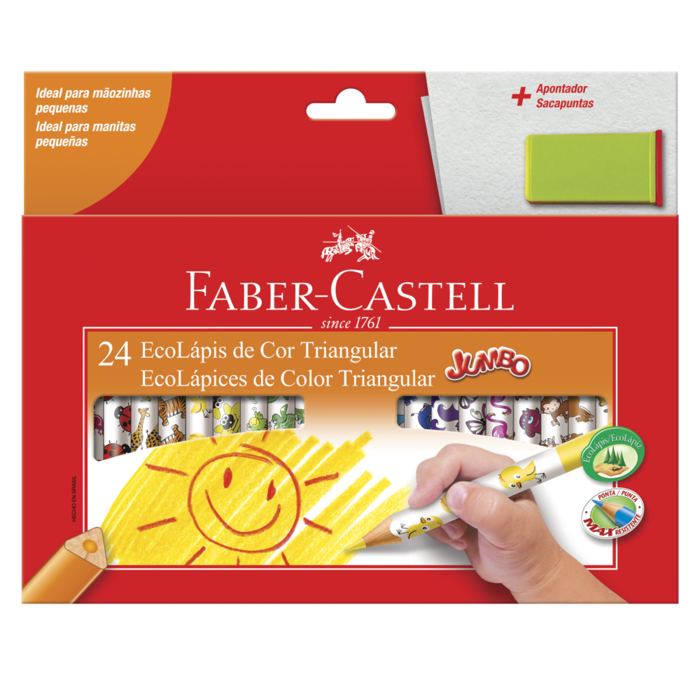 Deixe a criatividade fluir com os Ecolápis de Cor Jumbo da Faber-Castell. Os Ecolápis são formato Jumbo: ideal para mãos pequenas e estimula o desenvolvimento psicomotor das crianças. O formato triangular ergonômico dos Ecolápis garante conforto na pega, tornando o processo de aprendizagem muito mais divertido. Produzido com madeira 100% reflorestada e certificada pelo FSC: respeito ao meio ambiente. ATENÇÃO! Não recomendável para crianças de até 3 (três) anos, por conter parte(s) pequena(s) que pode(m) ser engolida(s) ou aspirada(s). Produto atóxico e não perecível. Este produto pode ser reciclado. Vamos limpar o planeta juntos.